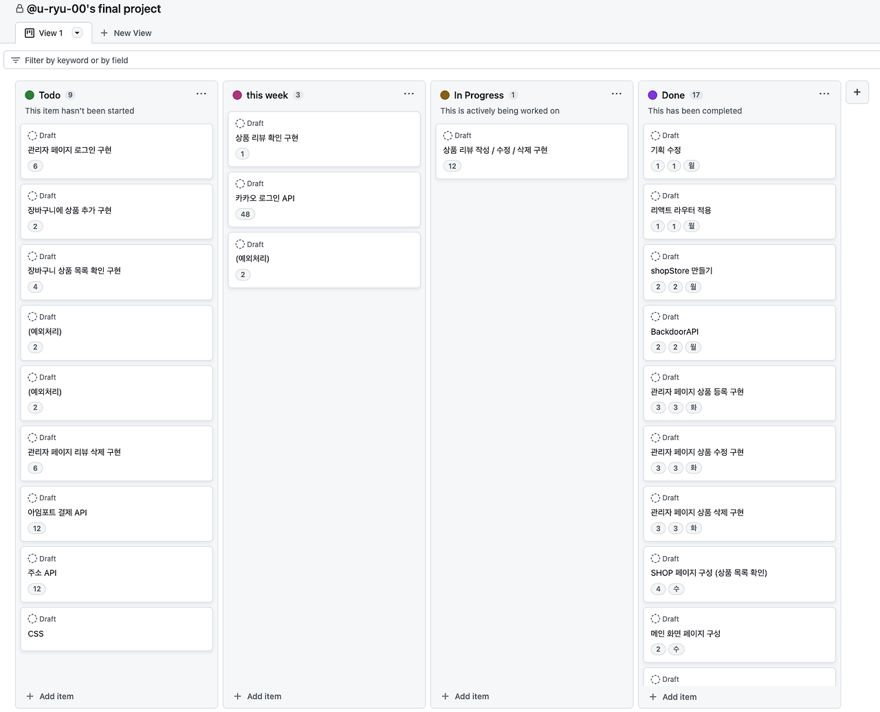 나는 git 프로젝트 칸반보드 기능으로 작업을 관리했는데 To do, In Progress, Done 외에 this week 칸을 추가로 만들어서 이번주의 To do만 따로 담아 일주일 목표를 확인할 수 있도록 하였다.